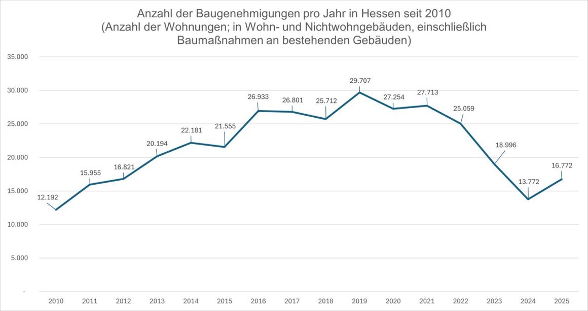 „Im abgelaufenen Jahr 2025 haben sich die Baugenehmigungen in Hessen erfreulicherweise stabilisiert und lagen 21,8 Prozent über dem sehr niedrigen Vorjahr 2024. Erfreulich ist, dass 2025 die Baugenehmigungen in Hessen doppelt so stark gestiegen sind wie der Bundestrend mit plus 10,8 Prozent. Zur Wahrheit gehört jedoch, dass wir in Hessen von einem sehr niedrigen Niveau kommen, denn das Vergleichsjahr 2024 markiert ein 14-Jahrestief. Zudem liegen die 2025er Baugenehmigungen für 16.772 Wohnungen rund 9.000 Wohnungen unter dem Neubaubedarf in Hessen, der bei rund 26.000 Wohnungen pro Jahr liegt. Und nicht jede genehmigte Wohnung wird auch gebaut. Das zeigt, wie wichtig es ist, bei der Senkung der Baukosten nicht nachzulassen, damit mehr Wohnungen genehmigt und auch gebaut werden.“